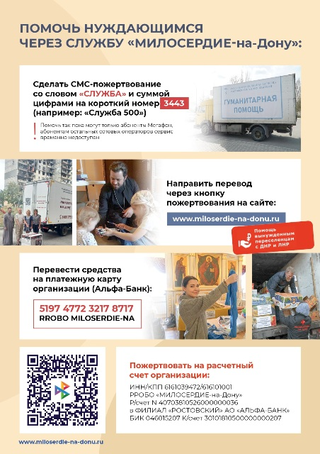Оказать помощь нуждающимся через Службу «МИЛОСЕРДИЕ-на-Дону», можно, направив средства по реквизитам во вложении, а также доставить необходимое по адресу: г. Ростов-на-Дону, ул. Орбитальная, 1 «б».