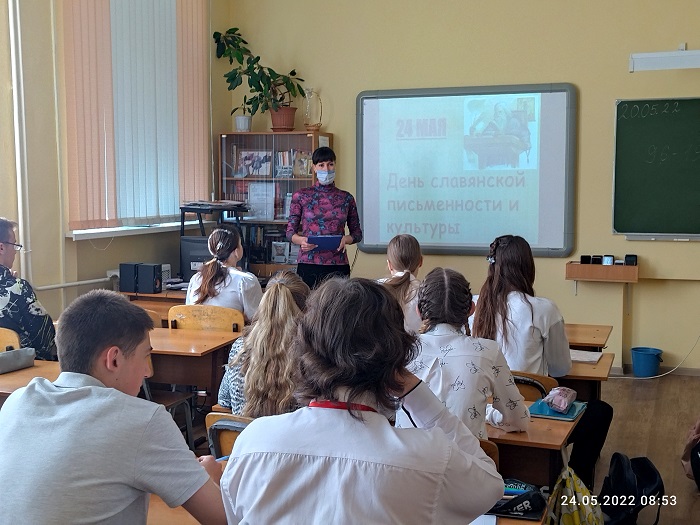 Сотрудником библиотеки им. М. Горького в МБОУ Лицее №6 для старшеклассников была проведена викторина «И будет помнить Русь святая святых апостолов славян…», посвященная Дню славянской письменности и культуры. Ребята ответили на вопросы, узнали об истории праздника, о первоучителях славянских народов – Кирилле и Мефодии, посмотрели видеопрезентацию об особенностях первой славянской азбуки и значении её букв.