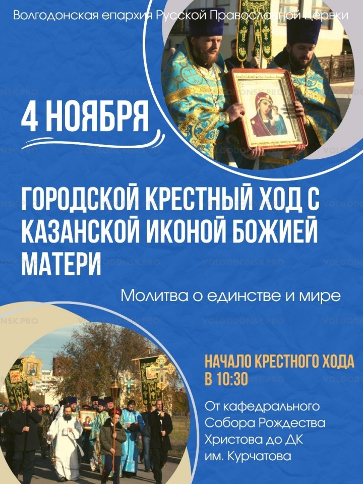 4 ноября, в День народного единства и в день празднования Казанской иконы Божией Матери в Волгодонске снова пройдет большой крестный ход. Он начнется от кафедрального собора Рождества Христова в 10:30, по окончании Божественной литургии. Верующие пройдут по улице Маршала Кошевого и проспекту Курчатова к площади перед ДК имени Курчатова. Там в 11 часов начнется концертная программа.