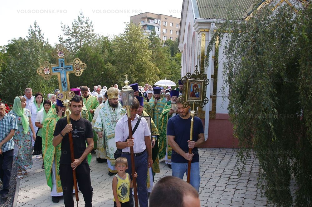 Праздничную Божественную литургию возглавил глава Волгодонской епархии, епископ Волгодонский и Сальский Антоний. Чтобы все желающие смогли присутствовать а службе, ее было решено проводить на улице. Для этого из алтаря в притвор храма был вынесен престол. После службы по традиции верующие прошли вокруг храма крестным ходом. А затем для всех гостей праздника были накрыты столы. Прихожане храма и воспитанники воскресной школы подготовили праздничный концерт.