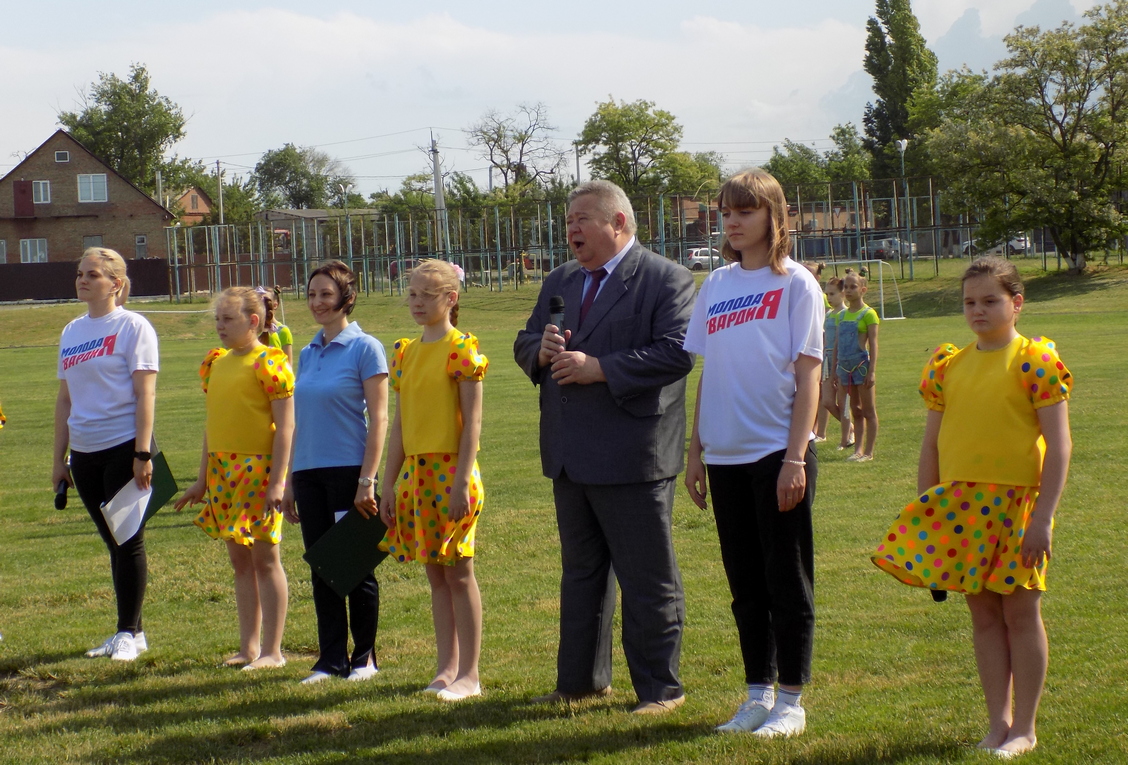 На пушистом зеленом поле стадиона состоялся танцевальный флешмоб для дошколят. Его провели воспитанники хореографического коллектива "Авантаж" и ПОШ "Росток" ЦВР. Подарили свои песни и танцы, помогли организовать ребят, настроить их на праздничный ритм воспитанники вокальной студии "Россиночка" ПОШ "Росток" ЦВР, участники нашего районного отделения "Молодой Гвардии Единой России" и народная студия танца "ART DANCE".