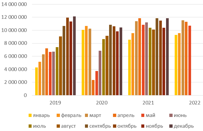 По данным оператора системы безналичной оплаты «АРПС», среднемесячное количество транзакций в эти три месяца превышало отметку 10,5 млн даже в пандемийный 2020 год. Периодически в число лидеров попадает также март – 9,8 млн транзакций по итогам четырех периодов.