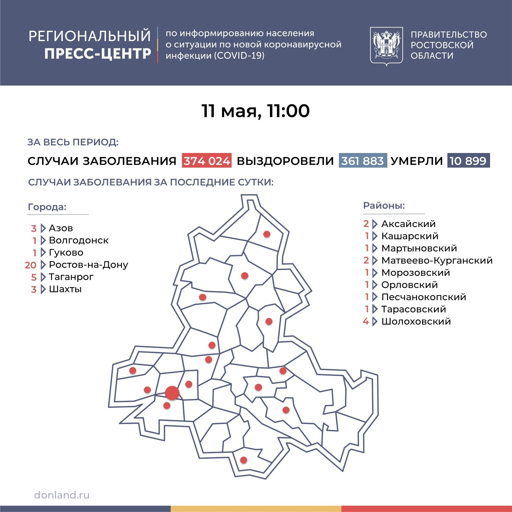 Новые инфицированные зарегистрированы в 15 городах и районах региона: в Ростове-на-Дону (20), Таганроге (5), Шолоховском (4) районе, Азове (3), Шахтах (3), Аксайском (2), Матвеево-Курганском (2) районах, Волгодонске (1), Гукове (1), Кашарском (1), Мартыновском (1), Морозовском (1), Орловском (1), Песчанокопском (1), Тарасовском (1) районах.