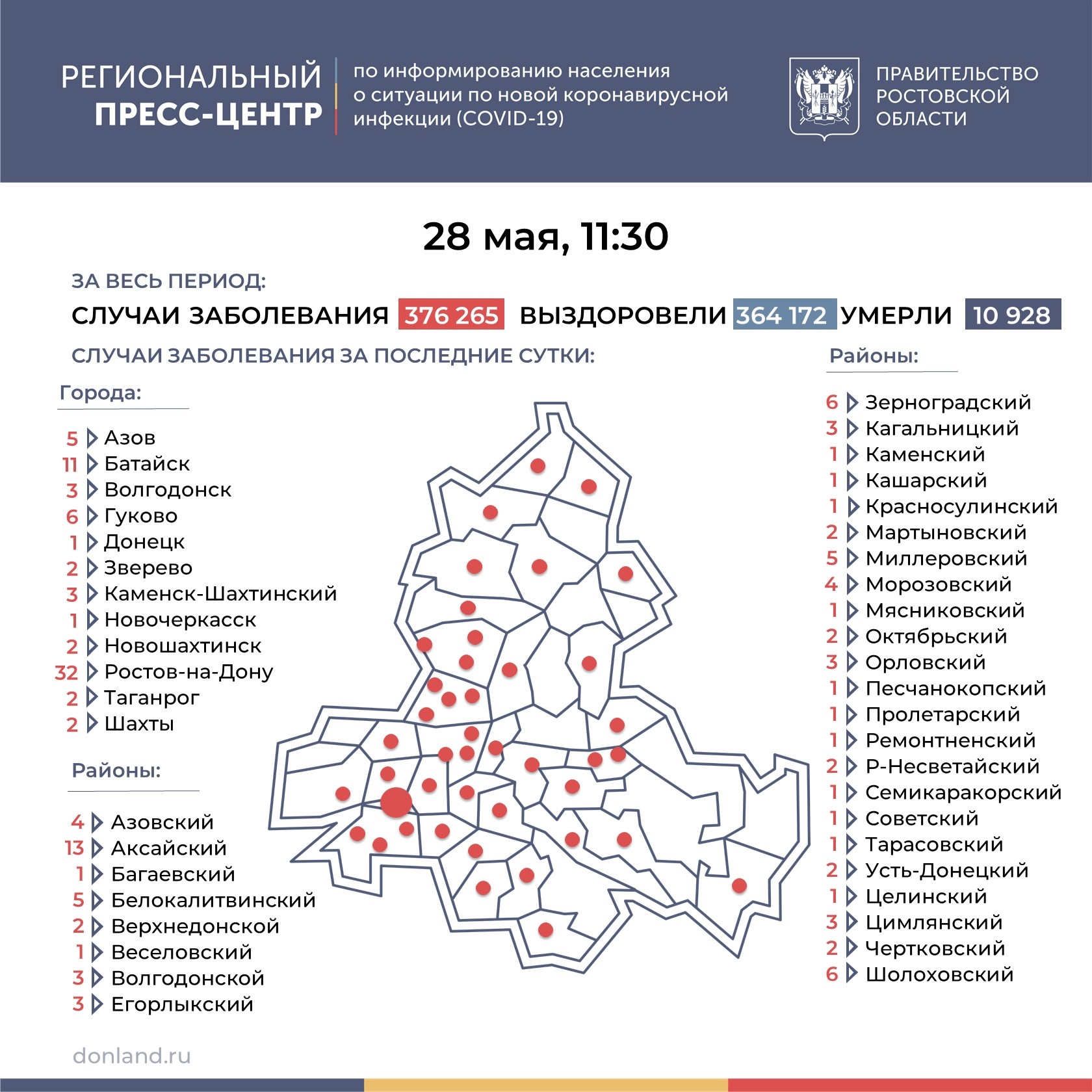 Новые инфицированные зарегистрированы в 43 городах и районах региона: в Ростове-на-Дону (32), Аксайском (13) районе, Батайске (11), Гукове (6), Зерноградском (6), Шолоховском (6), Белокалитвинском (5) районах, Азове (5), Миллеровском (5), Азовском (4), Морозовском (4), Волгодонском (3) районах, Волгодонске (3), Егорлыкском (3), Кагальницком (3) районах, Каменске-Шахтинском (3), Орловском (3), Цимлянском (3), Верхнедонском (2) районах, Звереве (2), Мартыновском (2) районе, Новошахтинске (2), Октябрьском (2), Родионово-Несветайском (2) районах, Таганроге (2), Усть-Донецком (2), Чертковском (2) районах, Шахтах (2), Багаевском (1), Веселовском (1) районе, Донецке (1), Каменском (1), Кашарском (1), Красносулинском (1), Мясниковском (1) районах, Новочеркасске (1), Песчанокопском (1), Пролетарском (1), Ремонтненском (1), Семикаракорском (1), Советском (1), Тарасовском (1), Целинском (1) районах.