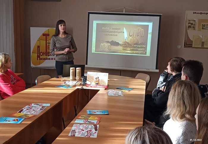 Сотрудником библиотеки им. М. Горького с первокурсниками техникума дизайна и сервиса «Дон-Текс» был проведён познавательный час «Всем миром против СПИДа».