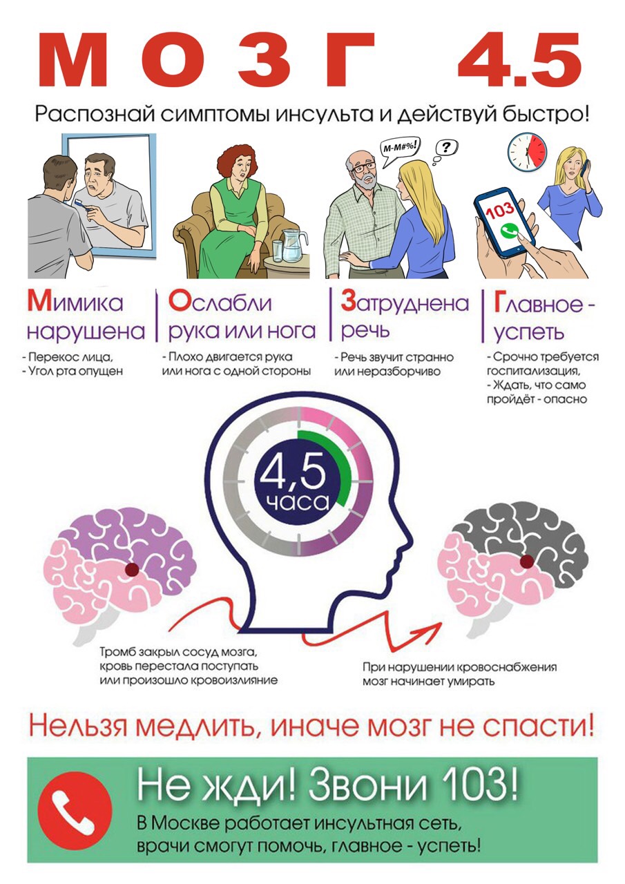 «МОЗГ 4,5» — это мнемонический тест, разработанный для эффективного запоминания того, как распознать симптомы инсульта и что именно необходимо сделать: