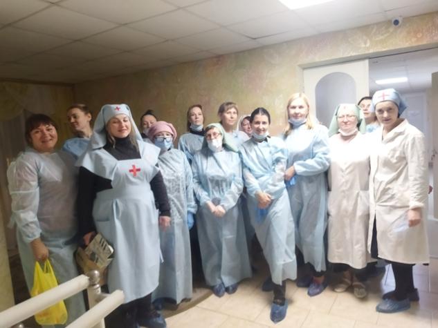 Помочь медикам в этот напряженный день приехали сестры милосердия и больничные волонтеры. Они купали и кормили немощных людей, застилали для них постели, помогали надеть чистую одежду… Из Центра Гуманитарной помощи Ростовской епархии волонтеры привезли одежду, резиновые тапочки, полотенца, средства по уходу за лежачими больными. Сестры милосердия храма Всех Святых, в Земле Российской просиявших, города Ростова-на-Дону раздали пациентам пирожки, испеченные прихожанами.
