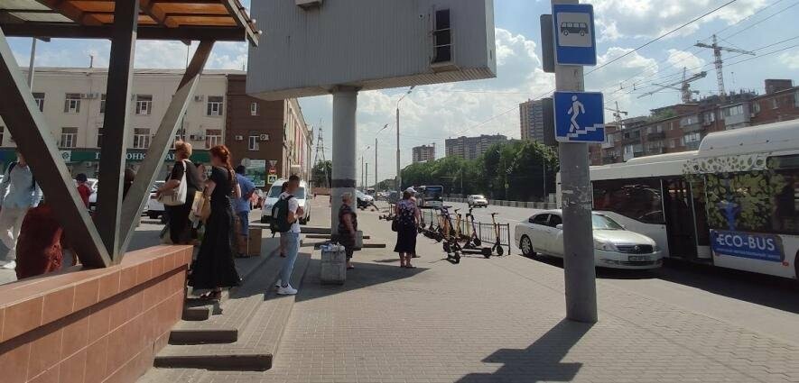 Ростовчане прячутся от летнего солнца в тени рекламного экрана на остановке / Фото 1rnd.ru