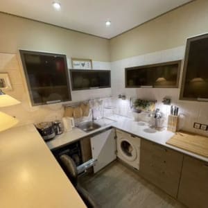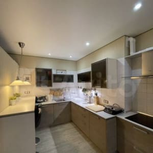Входная дверь Торэкс, межкомнатные Sofia, кухонный гарнитур Дедал, все дверцы на доводчиках. В кухню встроена техника: посудомойка, стиральная машинка, индукционная панель, духовой шкаф, микроволновка. В квартире два сплита: в спальне и в зале.